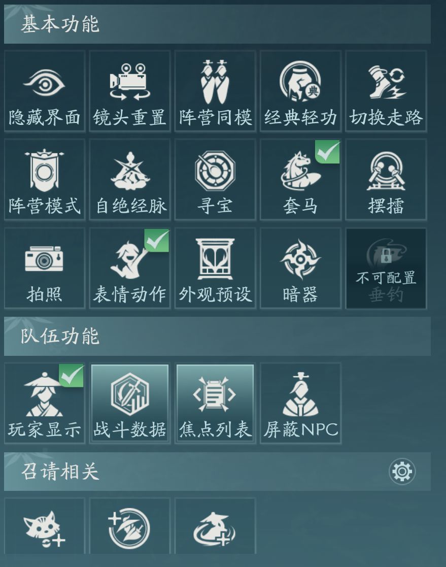 这里主要是从游戏玩法或设置中提取的一些比较常用的功能组成的快捷菜单,方便我们便捷使用,可以通过配置选择自己常用的三个功能 将其显示在主界面上。