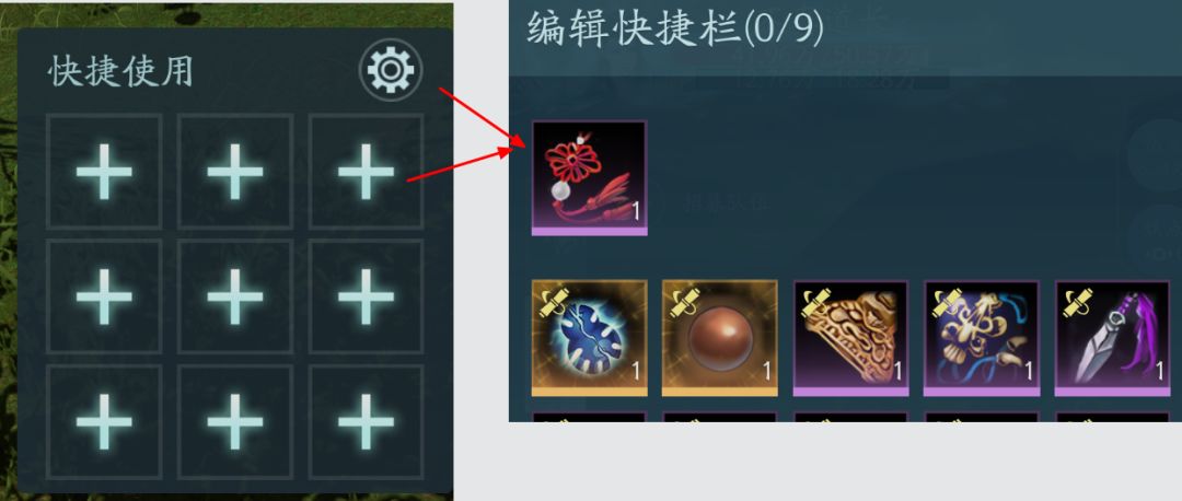 这里主要配置一些我们常用的道具,药品、食物、特效装备等等,方便我们快速使用。点击设置按钮可以一次全部配置快捷道具栏,点击加号按钮选择只配置当前位置的道具。