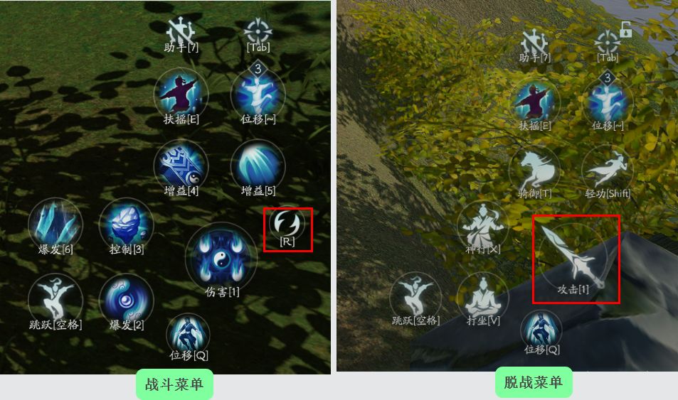 这里是角色的快捷技能栏,可以通过红框内的图标进行战斗菜单和脱战菜单的切换。