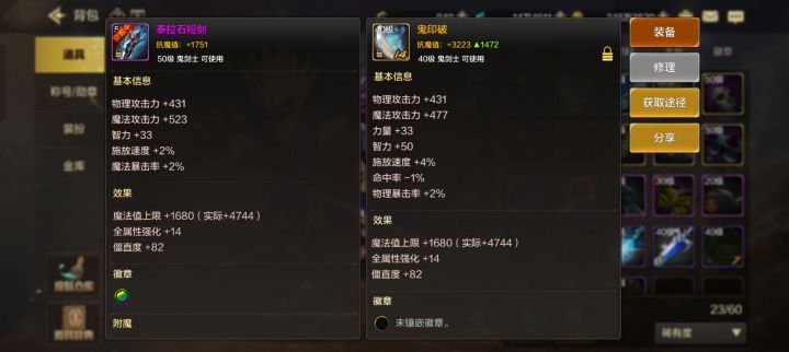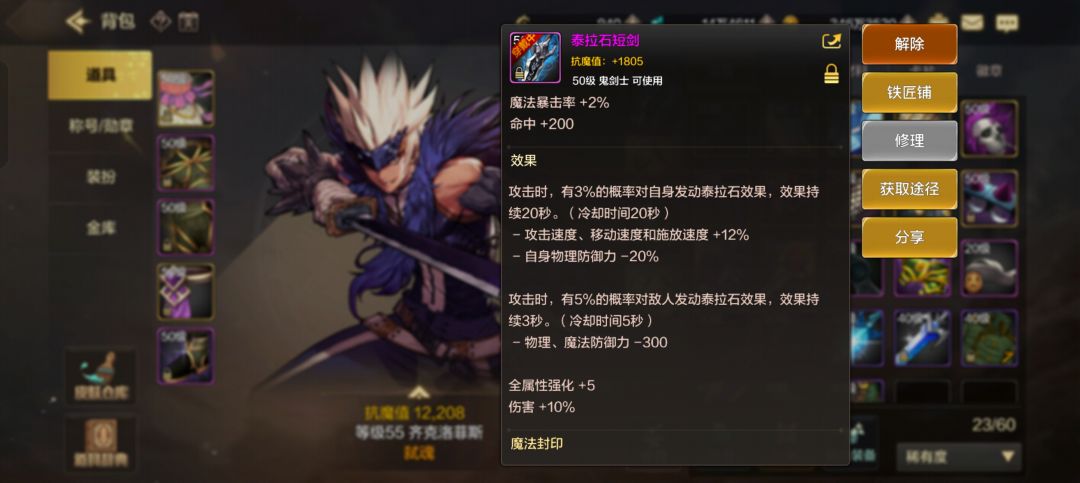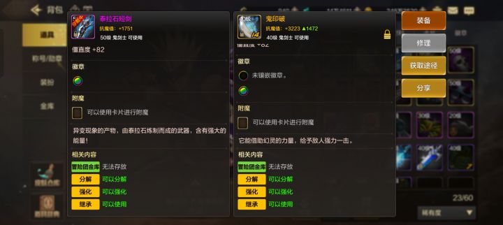 4.装备,图2和3可见pkc武器仅基本属性生效,强化无效,图4可见武器效果被统一了(泰拉加速没了),图5背包中泰拉旁边是斗者戒,也无效,所以做斗者是为了刷图?武器附魔徽章有效。图7和8是泰拉短和鬼印破的伤害对比,短剑攻速和太刀差距不明显,且太刀有减命中,所以选短剑pk没问题。