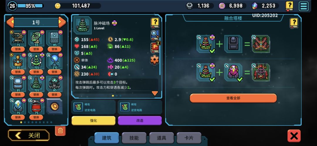 2、重复建同类塔会贵上5块钱。所以一开始,先蹦出一个橙红色塔再去造别的,这样的话可以避免把资源浪费在建同类塔上。一旦合成橙红色塔,那么前面的建塔数量会被重置。(例如我现在的电磁脉冲是155,后面合成出橙红塔后,再建电磁脉冲还是155,不会变贵)