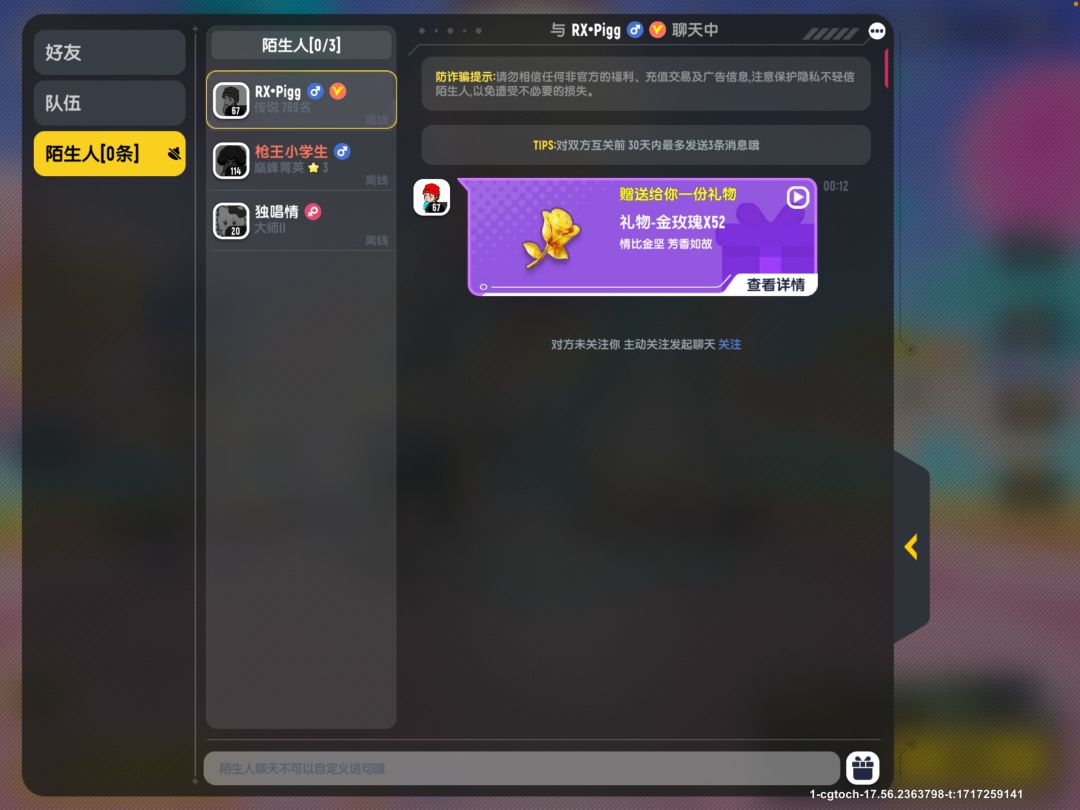 想着六一和朋友一起开开心心的打游戏就去点了个技术陪没想到一进来看我们是三个女生就给我们甩脸色(真的很离谱)后面私聊我还这么说语气真的很冲…主要是他打的也不厉害都四排了也不和我们交流就自己一个人莽…后面我让他和我妹朋友打双排结果也是打得非常拉垮以 33/50 结束了游戏并火速下线(我妹朋友口述的)