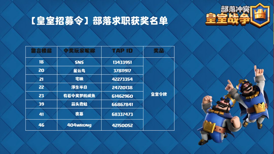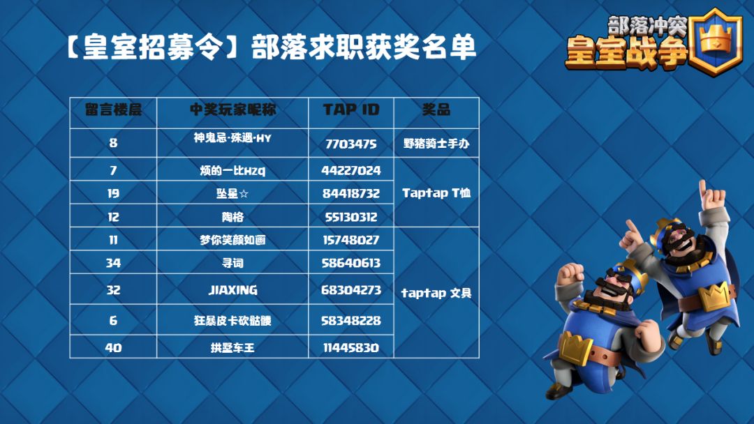 以下是 8 月 28 日 发布的《 皇室招募令:部落纳新大计划,丰厚奖励等你拿!》活动中奖名单,赶快来看看你有没有中奖吧!