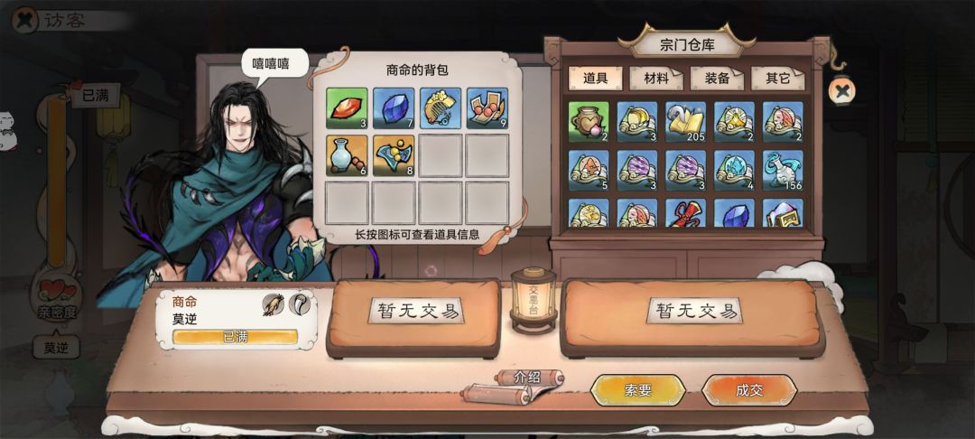 在仙栈客人的背包里有刷新出来的概率,我们可以通过宗门仓库的物品与客人进行交易。
