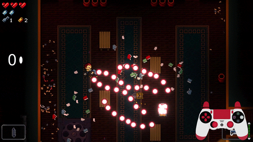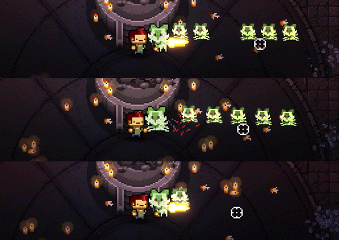 下图自上往下列出了爆炸、半自动、激光发射的弹药情况,爆炸攻击按一下攻击键就能放出若干相关弹药,子弹落点处还会触发一次AOE攻击,在第一次碰到物品后的x秒(预设,通常在1秒以下)内发生爆炸,通常来讲,激光攻击都会有专门的子弹,但这种攻击允许其他类型子弹的存在,表现效果如下图所示。