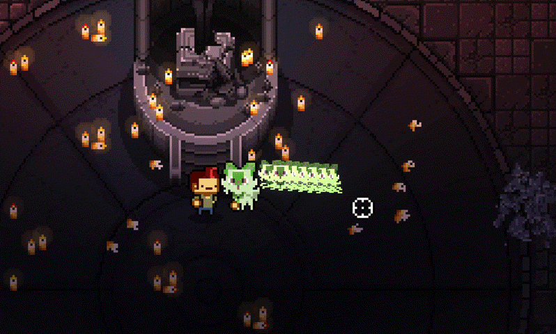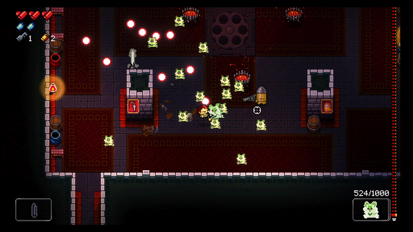 大多数敌人枪械的射速都在10-20这个区间内(初始状态玩家的移动速度在8附近),数字代表一个单位时间内移位的像素数量,单次攻击的冷却时间从0.5-2.5 s不等,初见玩家时,招式释放的冷却时间要比常态冷却时间稍微短一点。