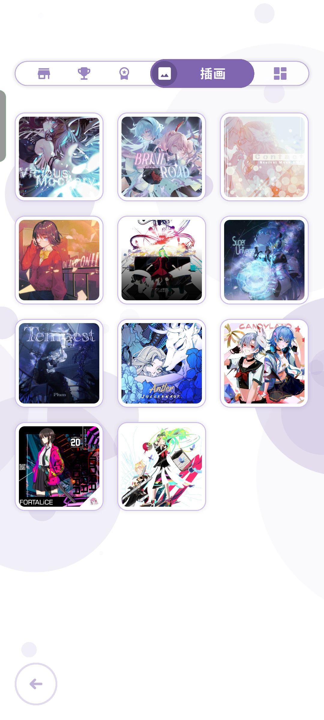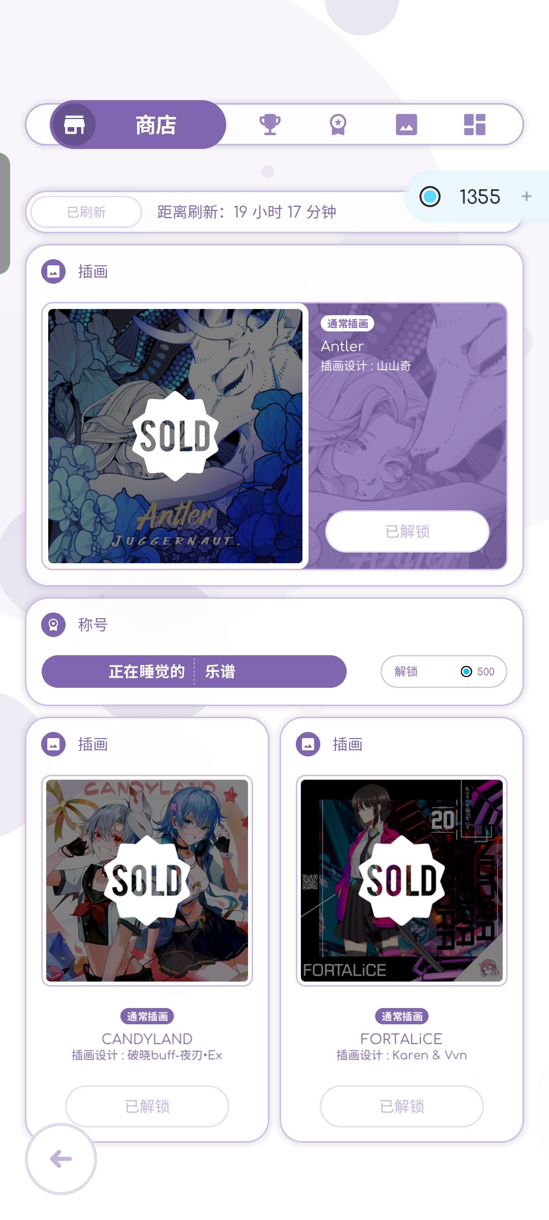 进入该板块后上方会存在五个小版块,分别为:“商店” “成就” “称号” “曲绘” “版式”(图8、9、10、11、12所示)