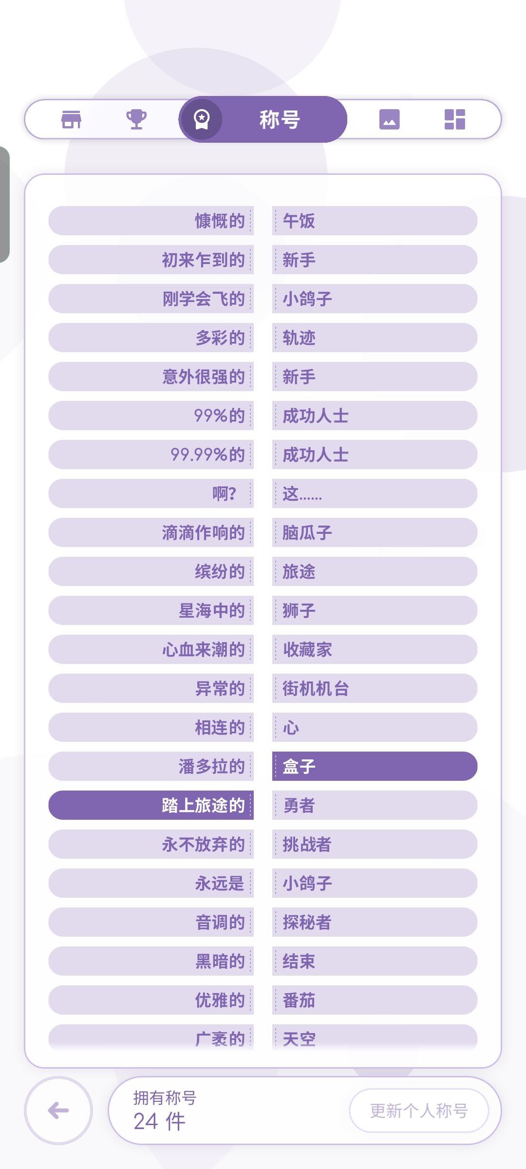 称号:每个称号分为左右两半,左右可随意组合,点击后按右下方“更新个人称号”即可