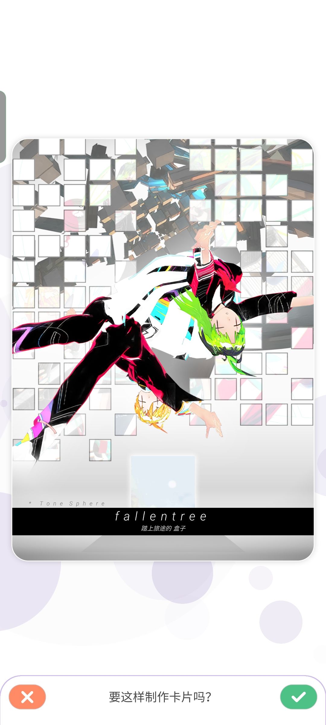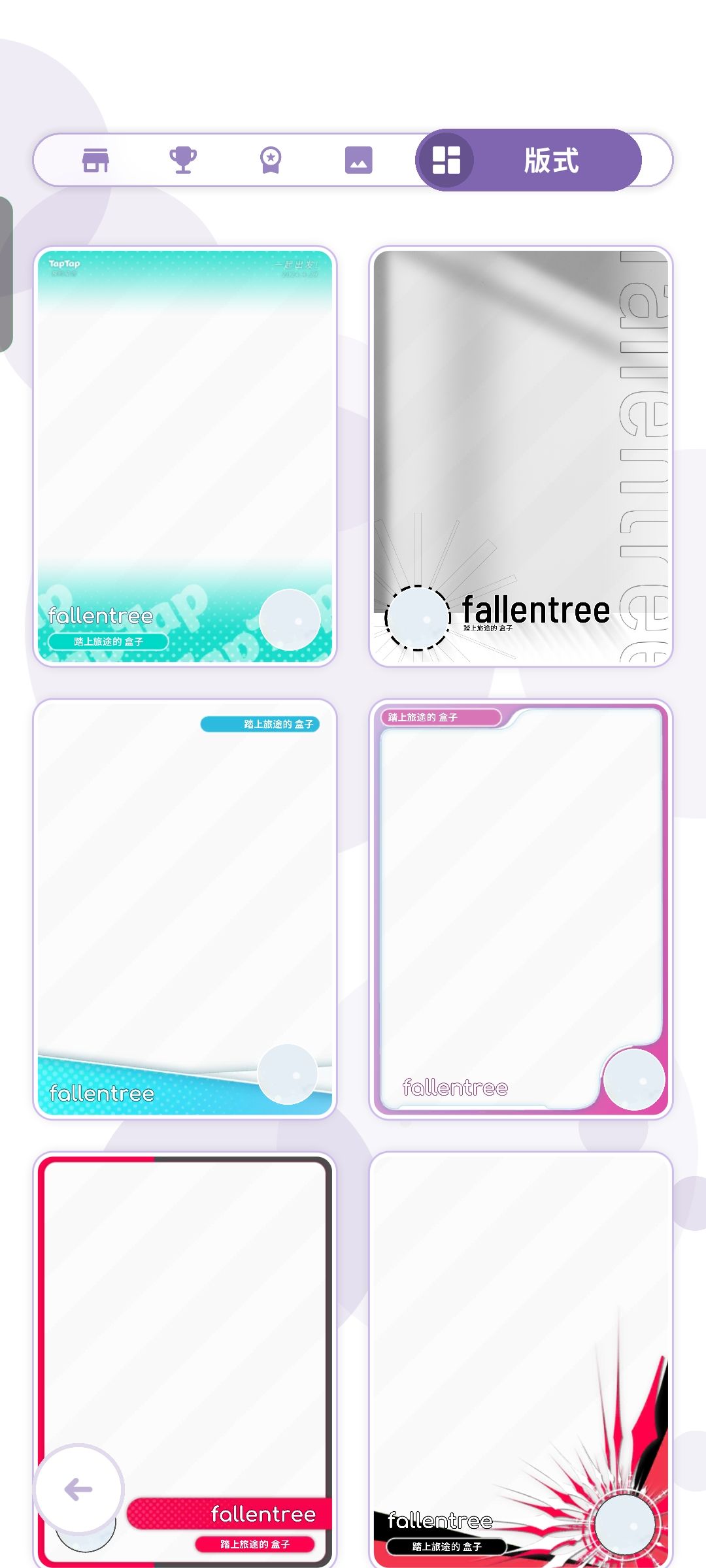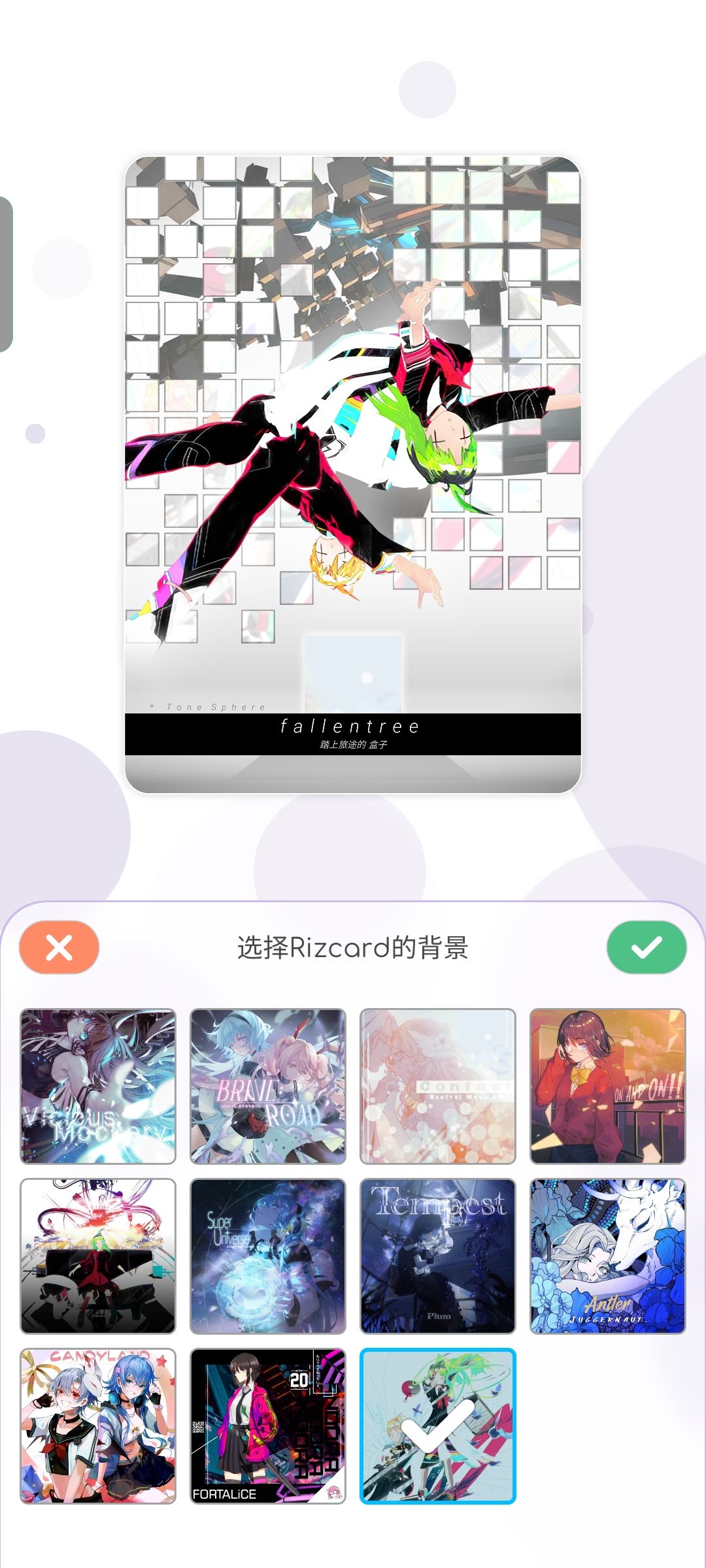 版式:在该栏上下滑动可选择对应版式,点击后该版式会放大,点击下方“以此版式开始制卡”,之后会显示你所拥有的曲绘,点击曲绘后,曲绘会显示在版式中(就是预览),再点击右方“✔”(绿色),再次确认,Rizcard便制作完成
