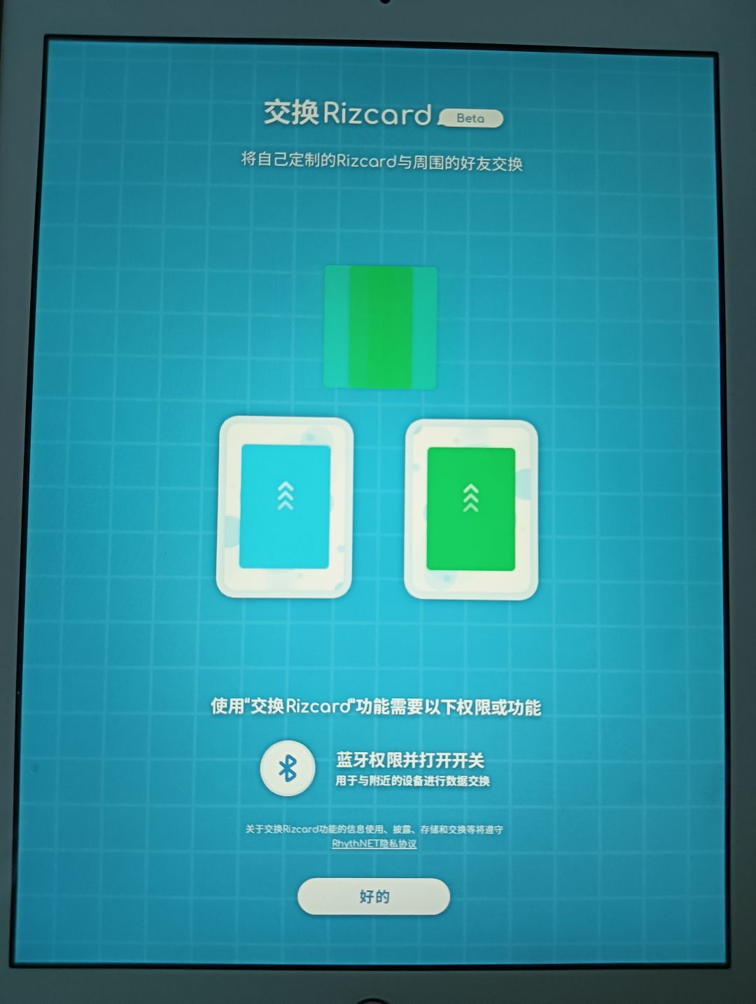 该板块入口右上为个人卡片展示(图1),在制作完个人卡片(Rizcard)后(后面介绍如何制作)可在入口点击,然后出现图4界面,在该界面上滑可进行换卡(若是第一次使用换卡,会出现图5提示)(该功能需要打开蓝牙功能,并授权Rizline使用⚠️),换卡时界面如图6所示