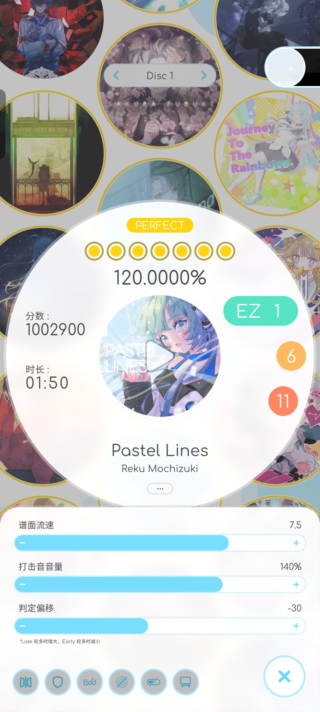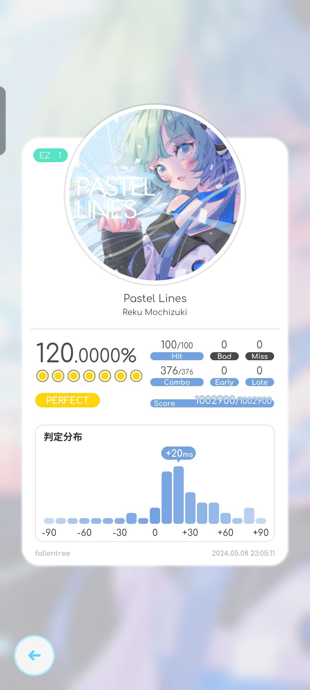 结算页面:结算主页面仍为游玩前界面,但屏幕下方会出现一个小长框,长框左边为本次游玩完成度和分数,中央为击打数,右边为最大Combo数,再次点击长框为详细结算页面,该界面可详细查看Bad,Miss,Early,Late的数量,下方为判定分布和本次游玩时间