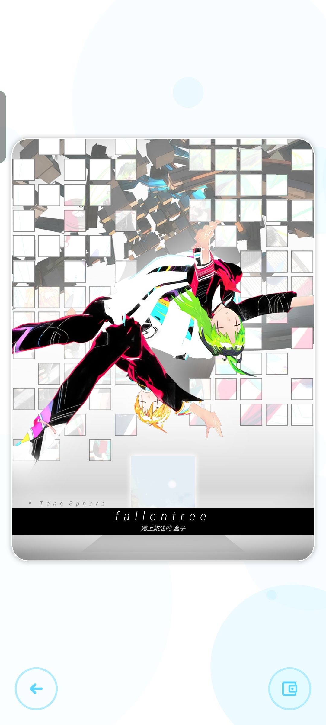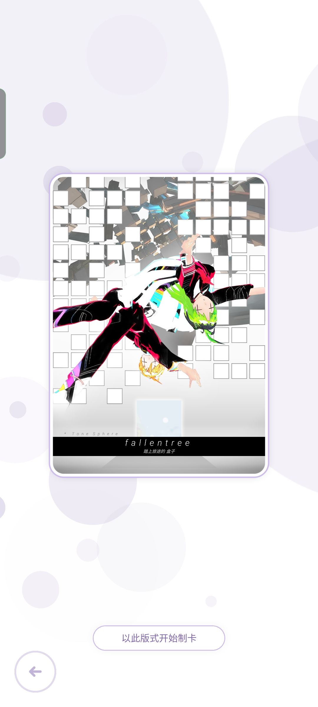 板块:有两个板块,分别对应“开始(蓝色,选歌)” “收藏(紫色,收藏品和个人卡片制作)”如图1、2,切换方式为左右滑动(滑动会有音效,且左右滑音效不同),点击对应颜色图标即可进入对应板块