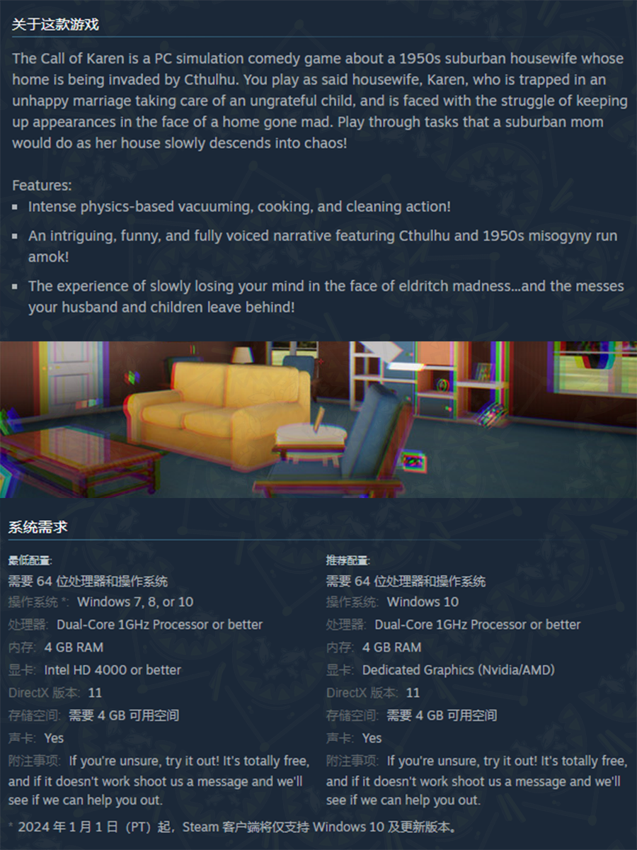 但本期是“游戏不推荐”,没有玩之前我以为游戏是与入侵家中克苏鲁大战三百回合的冒险游戏,但实际上是非常无聊的家务模拟器。并且非常让玩家容易晕3D。