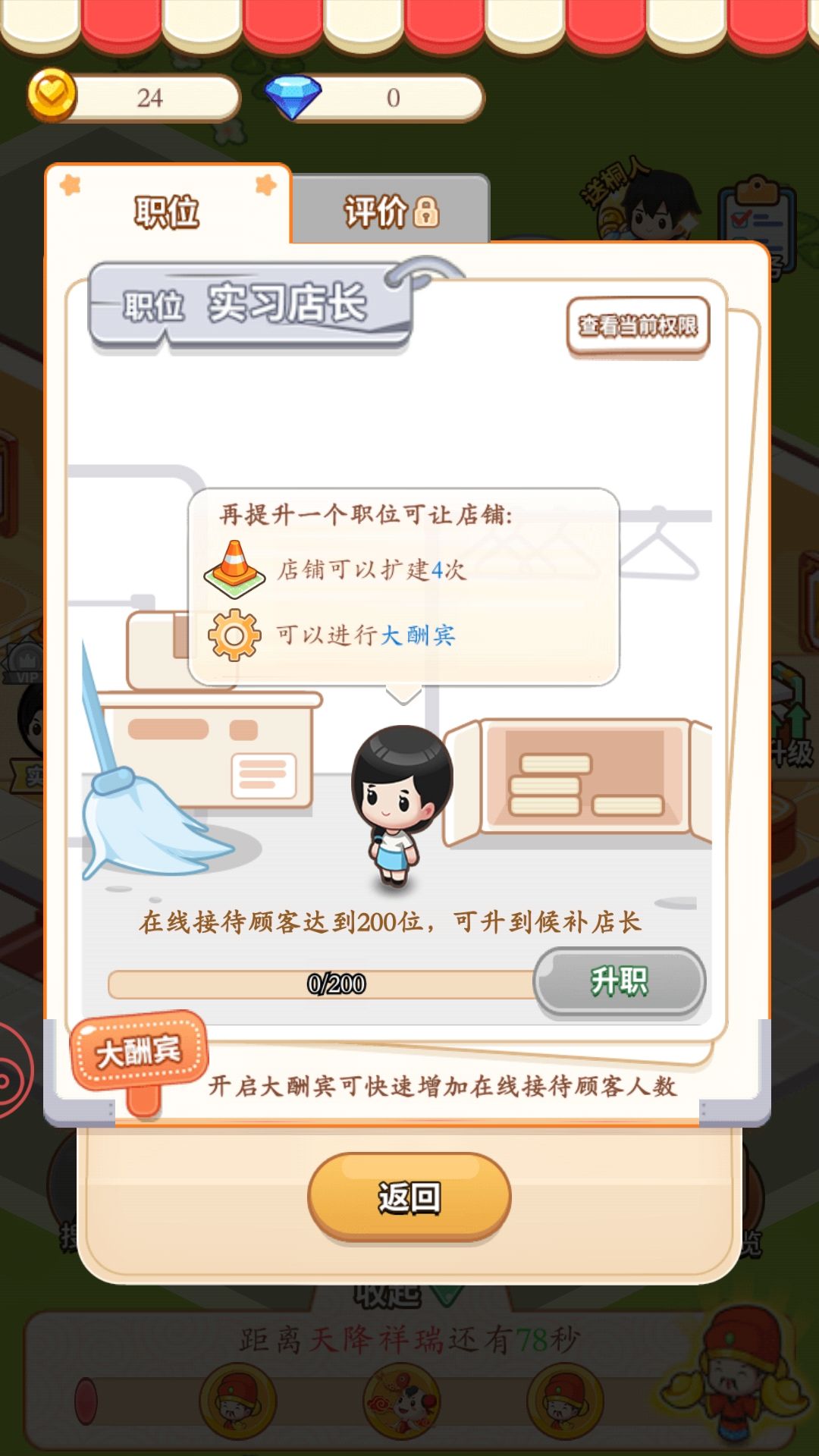 大酬宾是一个妙招,开启大酬宾可以快速地增加店长们在线招待顾客的数量,还能获得大量金币奖励~