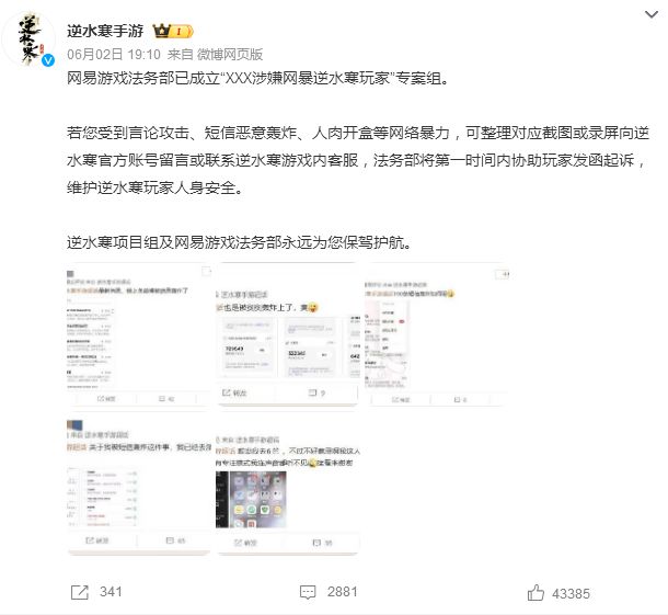 6月2日,网易游戏法务部站了出来,正式成立“XXX涉嫌网暴逆水寒玩家”专案组。