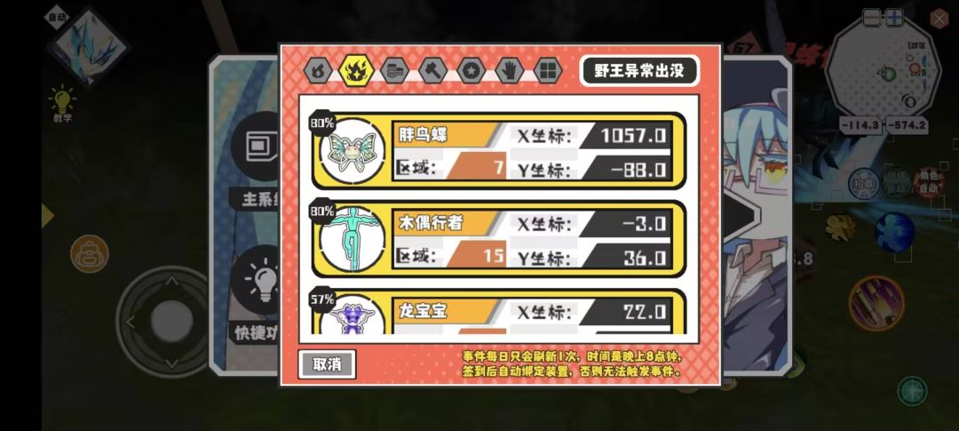 野王会固定生成在一个地点,野王的初始强度和最终强度都会影响野王的数量,野王的技能随机刷新。击杀野王后,会根据其种族掉落素材,晶石,强化石等,并且会有概率爆蛋,获得对应宠物。