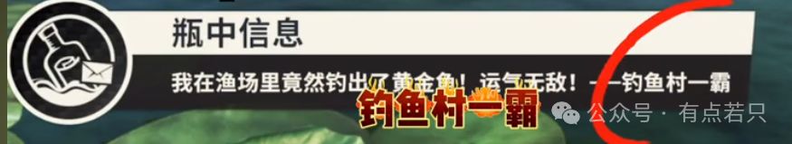 首先为大家介绍第一种钓法369典藏杆法 俗话说三崩必出大货。以碘化之齿为例,我们首先进渔场时先刷一个瓶中信息——钓鱼村一霸。