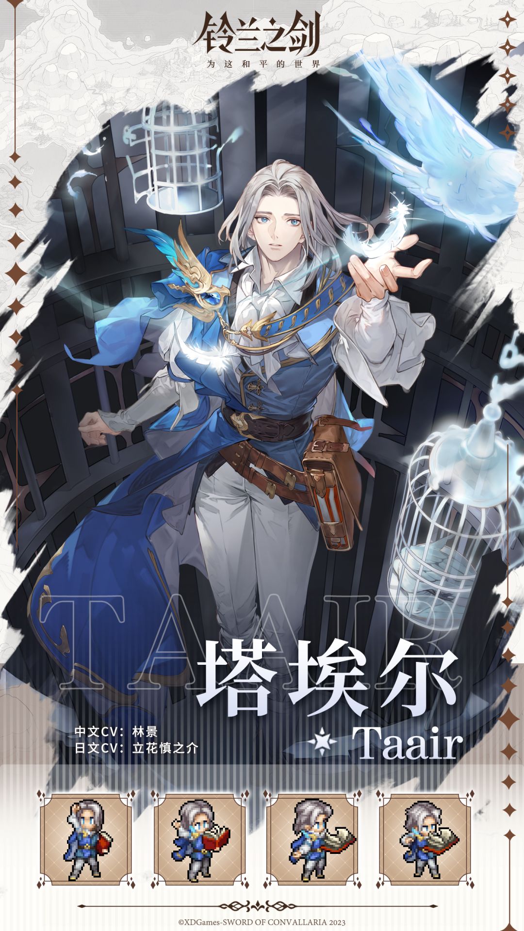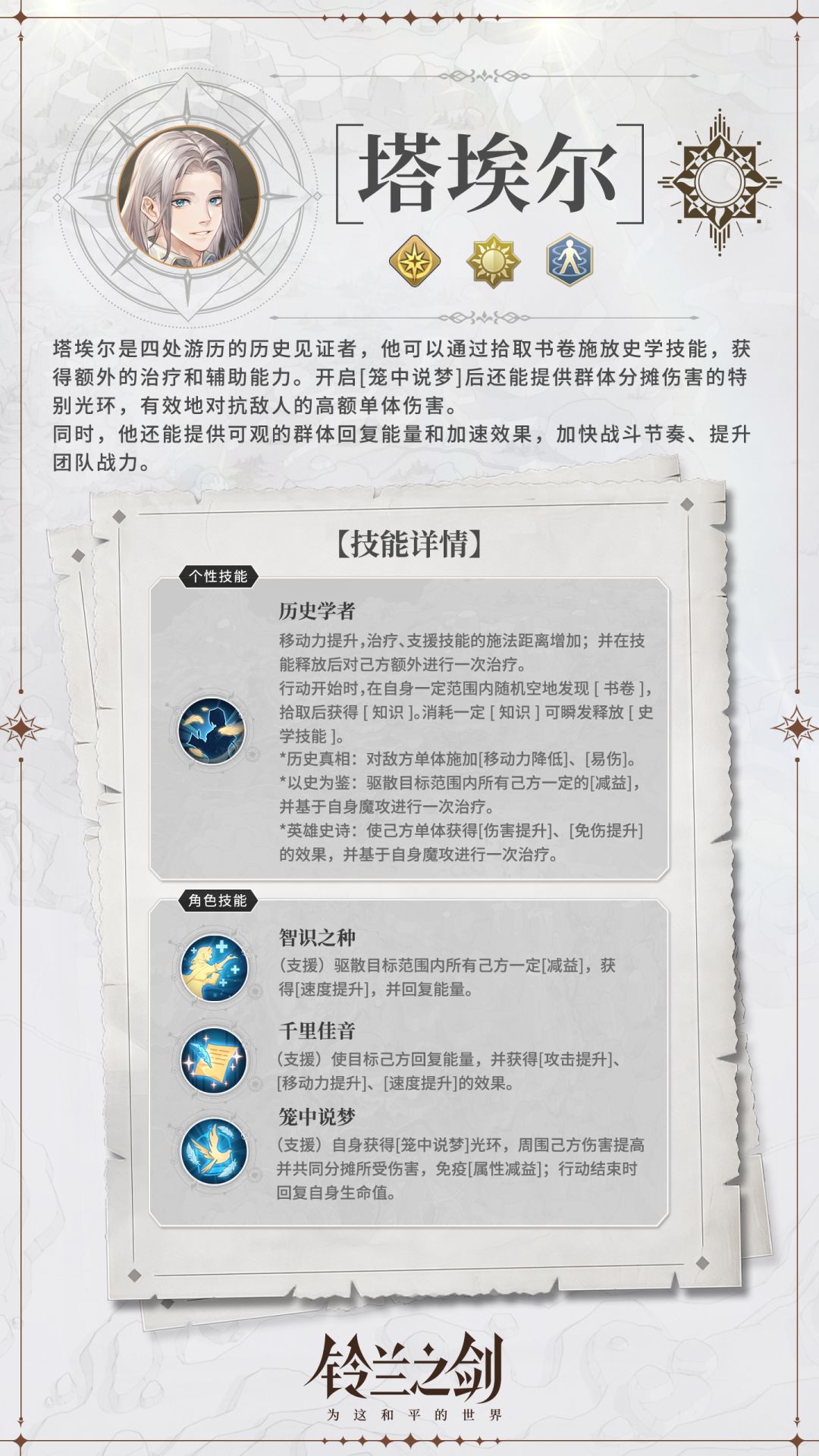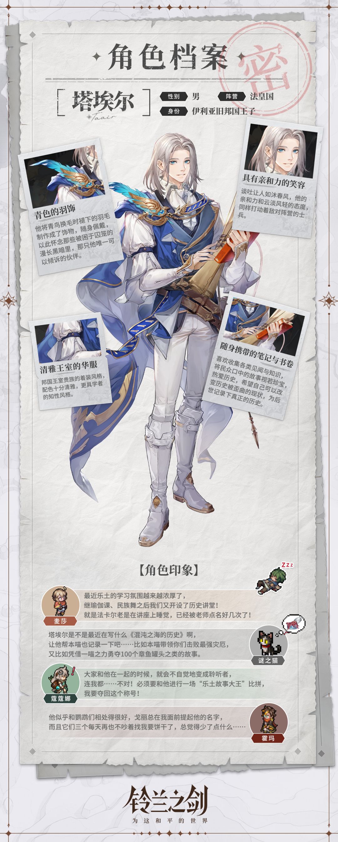 身为伊利亚旧邦国王子,塔埃尔风轻云淡、纯良温和,虽然被迫成为了法皇国打着旧邦国复辟旗帜的傀儡,但他从内到外都没有领袖样子,对权力和政治也毫无兴趣,更像一名爱好历史的学者。他坦然接受成为棋子的命运,却仍憧憬着浪迹天涯的生活,也从未忘记自己的理想——用笔尖记录下伊利亚真正的历史。