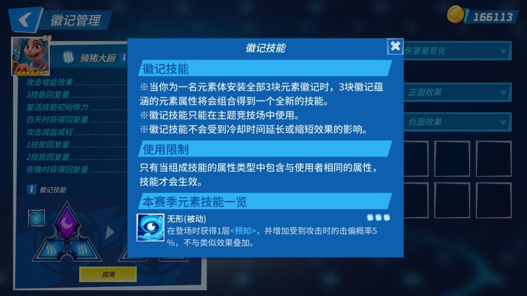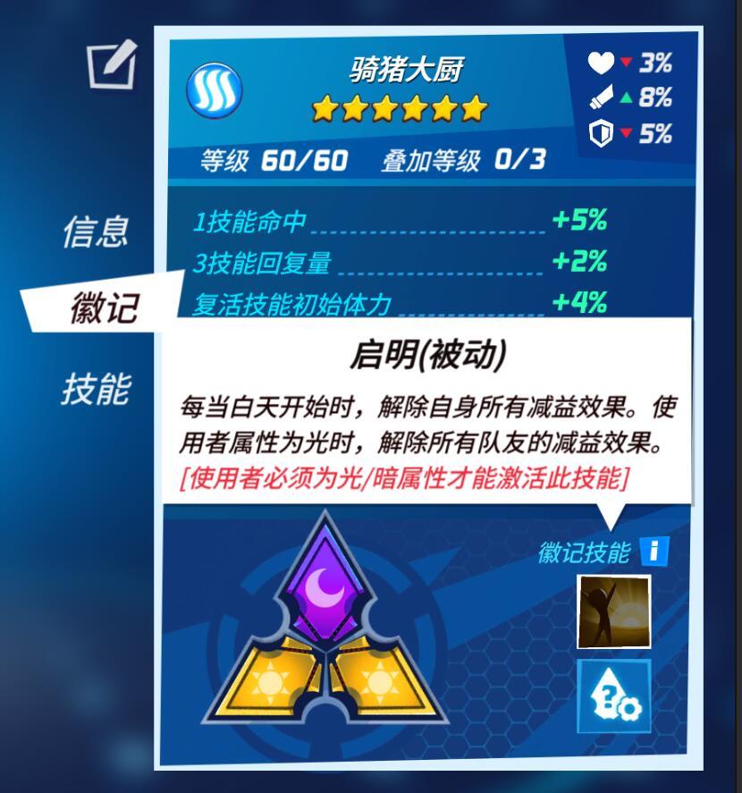“徽记”的诞生无疑会对竞技场内产生较大的影响,甚至有时候它的影响过于大了。因此,我们対“徽记”做出了一些限制,例如“徽记”的组合效果不是在所有情况下都能触发。如下图所示,该徽记组合效果的使用者必须为光/暗系才能触发。