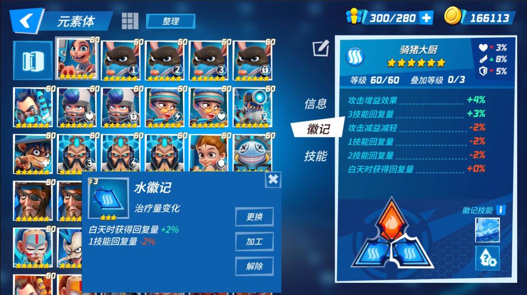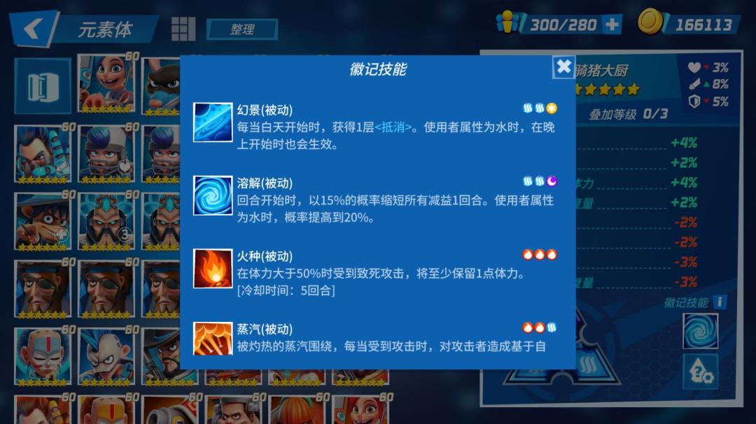 除此之外,我们还鼓励玩家根据“元素”和“徽记”的对应性去编队,所以我们给“徽记”的组合效果做了一个额外的设计:当卡牌的元素和徽记相对应时,这个徽记组合带来的效果会有额外的加成。