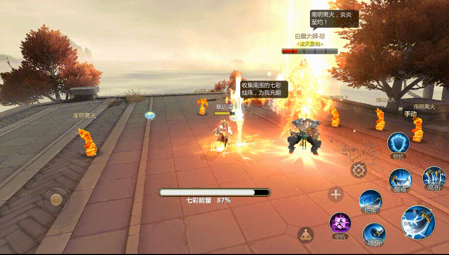 应对方法:当妙一神剑出现在场内时,我们需要收集场内的七彩仙珠来为神剑充能(靠近即可采集),在此期间页面下方将会显示七彩能量进度条。充能100%后就可以采集妙一神剑,此时将会获得一个特殊效果——变身为【七彩仙轮】,就可以完成本次成就了~