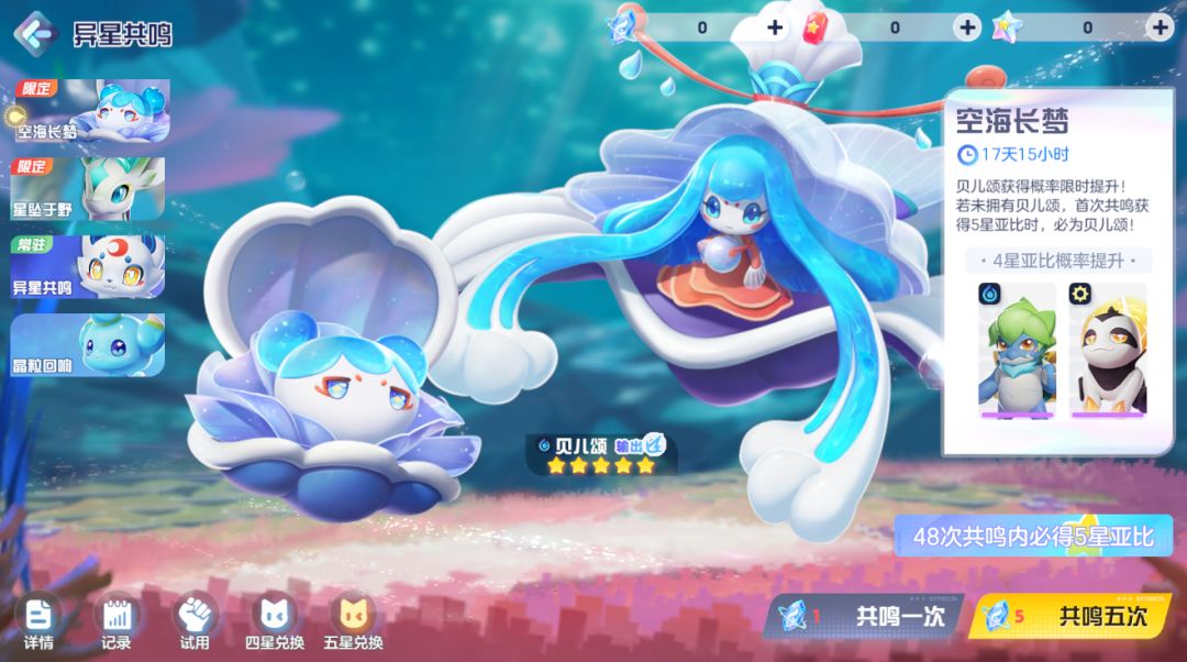 ※若在【空海长梦】共鸣中获得5星亚比时,不是贝儿颂,则下次共鸣获得的5星亚比,必定是贝儿颂。