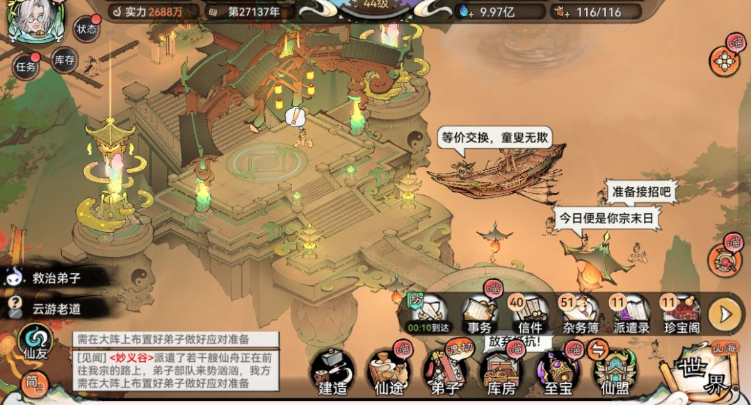 届时世界宗门会派遣弟子前来攻打宗门,宗门界面右下方会显示攻击队伍到达的时间。