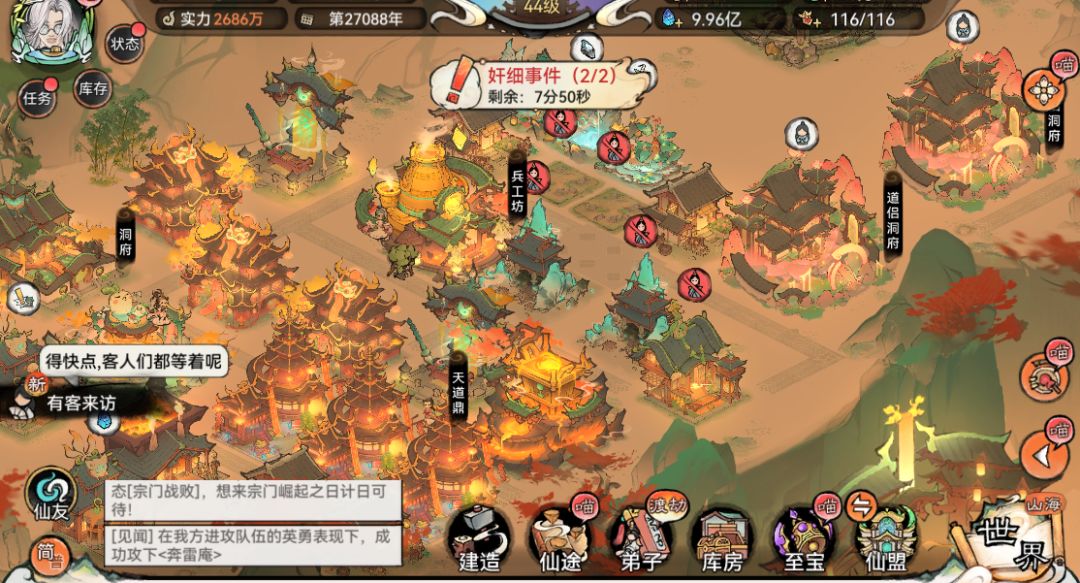 在新版本更新后,祖师可以同时对多个世界宗门发起进攻,但敌对关系下的世界宗门,也会有概率主动对祖师的宗门发起进攻,掠夺宗门资源。
