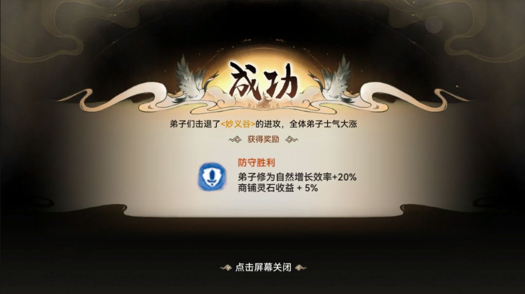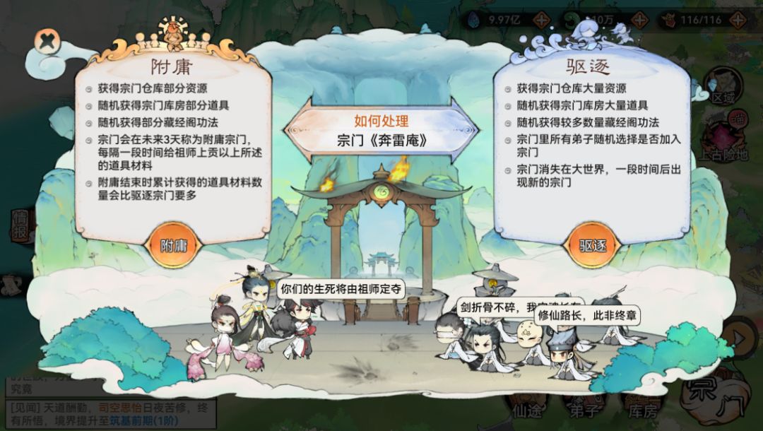 若成功击败敌宗,祖师可以选择将对方宗门驱逐出去或者将其纳为附庸,驱逐宗门可以获得该宗门库房的部分资源和道具还有功法秘籍哦。