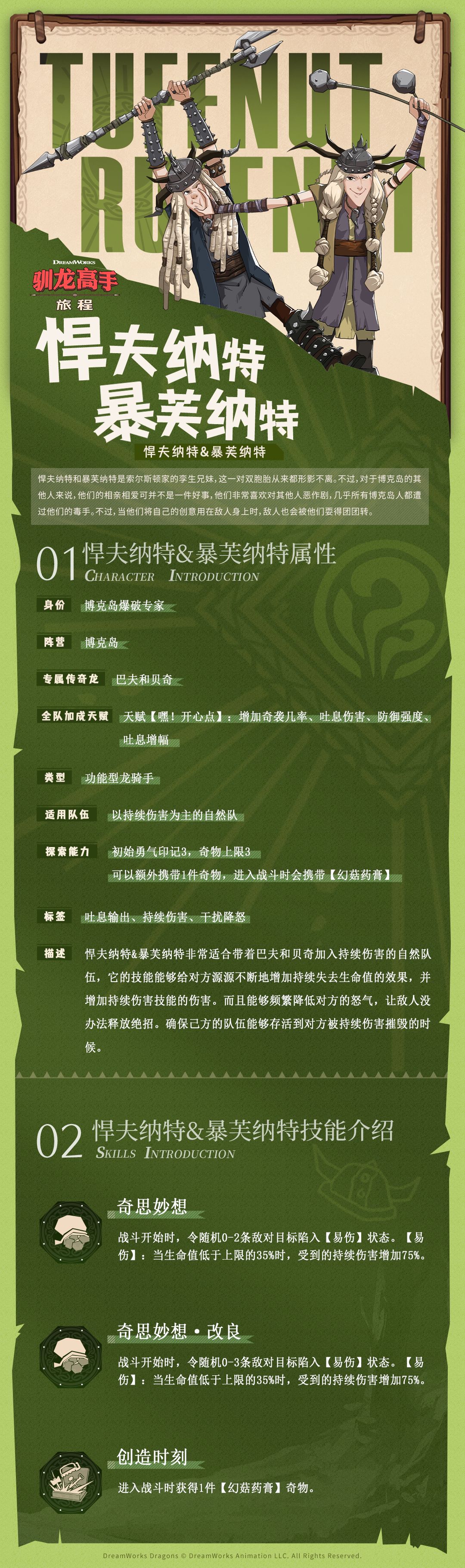作为《驯龙高手》的主角团,双胞胎【暴芙纳特】与【悍夫纳特】将会给敌人带来一些麻烦,作为对地方进行持续伤害的角色,他们将慢慢的折磨对手。