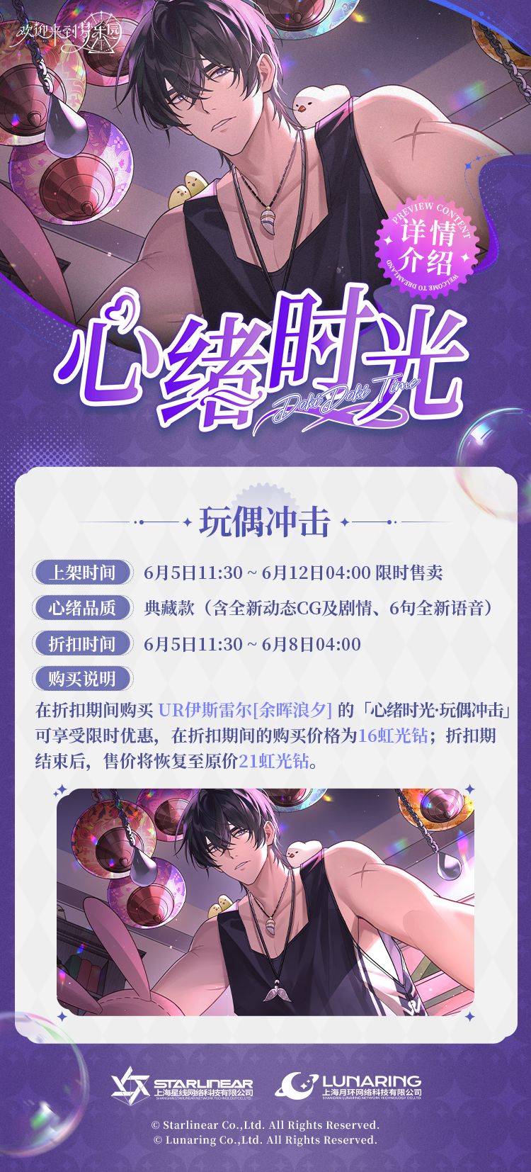 - 售价:在折扣期间购买「心绪时光·玩偶冲击」可享受限时优惠,在折扣期间的购买价格为16虹光钻,折扣期结束后,售价将恢复至原价21虹光钻。