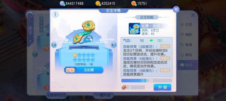 对于我们普通玩家来说,我们没有太多的资金进行喵喵宝藏进行抽奖,那么10个仙阶法宝碎片就可以让我们解锁一次全新的仙阶法宝玉如意!
