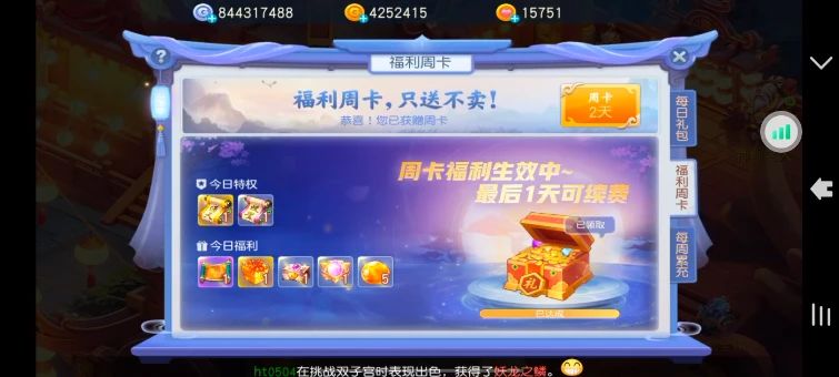 那么周卡福利还有着圣精灵,羽翼技能书,精灵宝钻,宝石等等一系列的奖励!7. 额外奖励