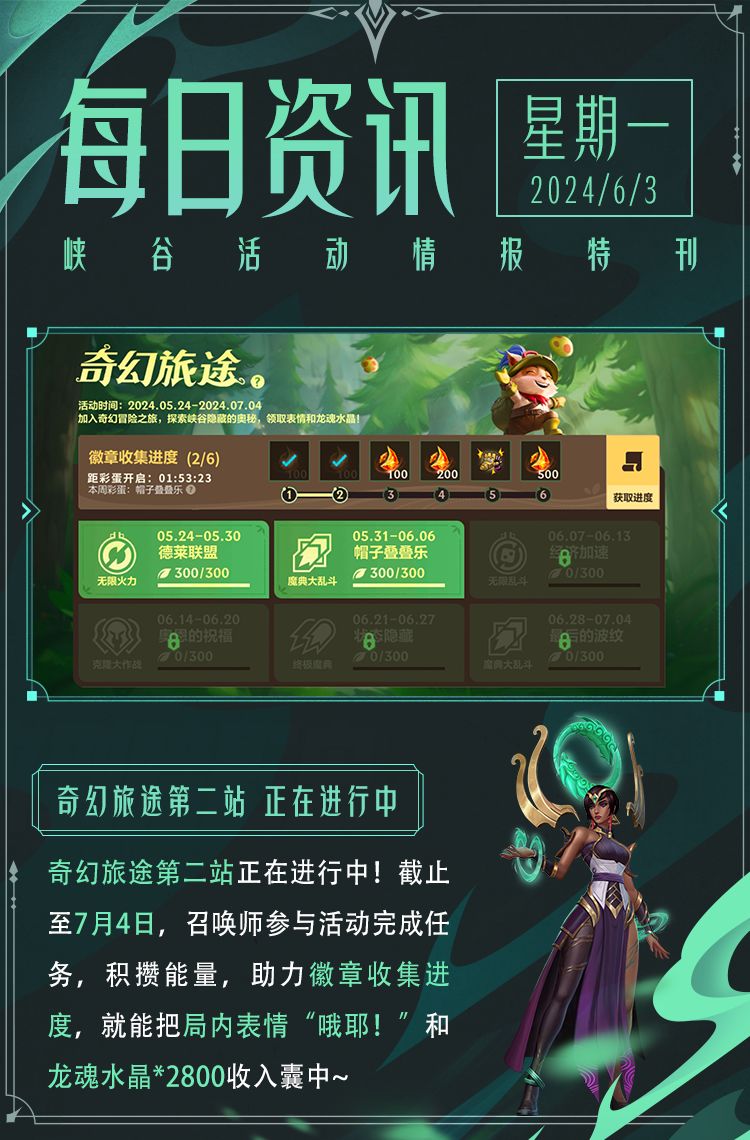 同时,5月龙魂试炼追赶奖励将于6月3日(今日)23:59分截止,召唤师们只需完成追赶任务,即可领取对应奖励~