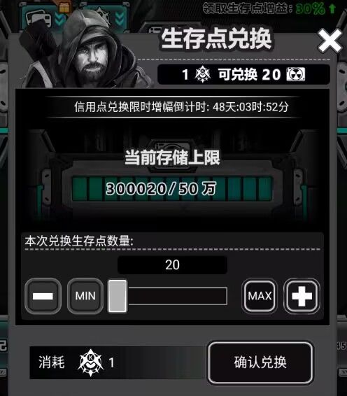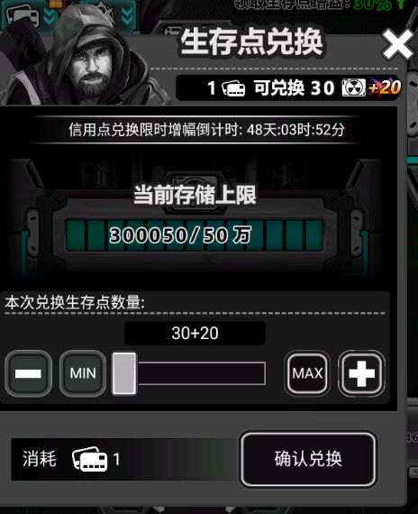 1信用点能兑换50生存点(活动加成)