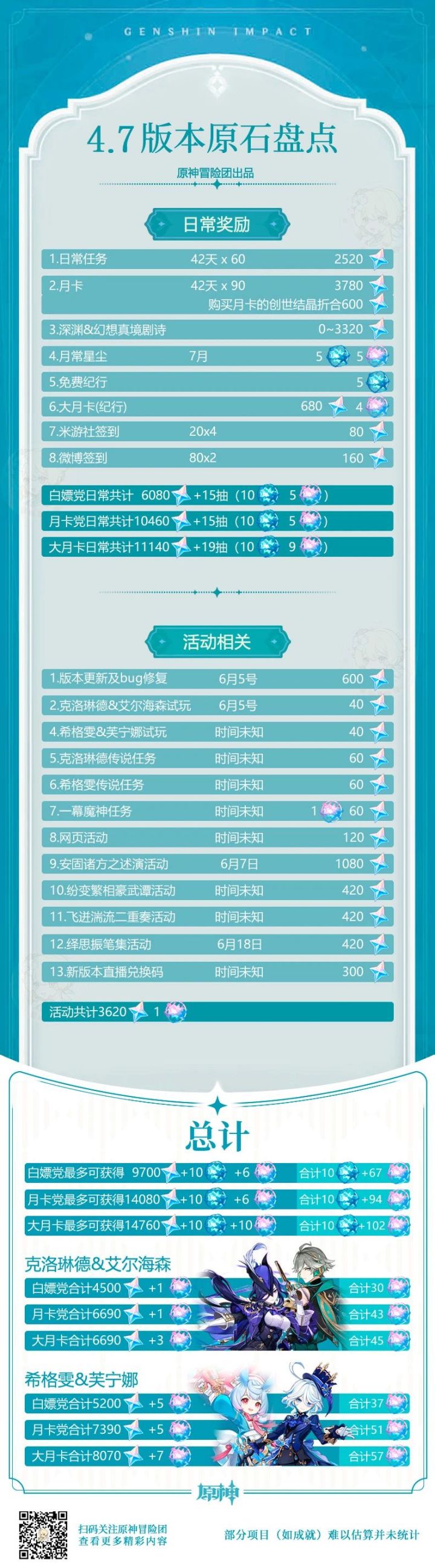 2、6月5号版本更新。7月的星辰商店参与本次统计,下版本直播的300原石兑换码放出时还在4.7版本,因此也计算到统计中。