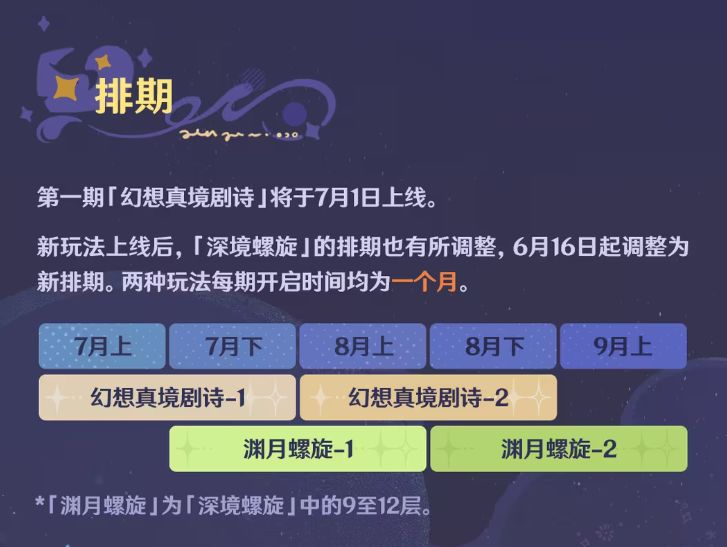 6、按照官方描述,6月下半的深境螺旋将会持续一个月,随后的排期可参考下图。7月17号才会进行4.8版本更新,因此7月下更新的深渊奖励我们统计进了4.7版本中,其他周期算法和此一致。