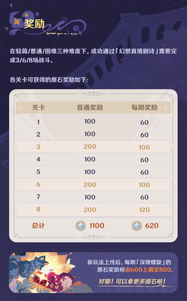 虽然深渊周期拉长了,但深渊每期奖励增加了。再加上新玩法的每期奖励,每个月我们可获取的奖励多了220原石(620+800-1200),总体来说是利好,你是如何看待的呢?