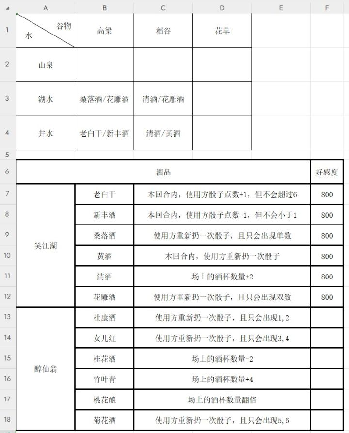 目前只有笑江湖有产出材料可以做酒,做出15个酒后送好感只能送到7000/8000,无法解锁更多的材料,下个月刷新材料可以送满好感,但只有5个花草可以造出醇仙翁的好感酒,如果和笑江湖一样每个酒800好感,那醇仙翁那边下个月也只能4000/5000,很可能得第三个月才能拿到山泉的酿造数据