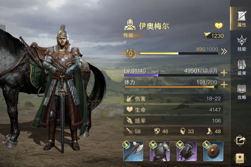 人族是伊奥梅尔,一技能是两回合一次两目标的伤害,二技能是骑兵加成,一点点免伤,初期感觉一般,伤害比较高,升级满是380倍率。