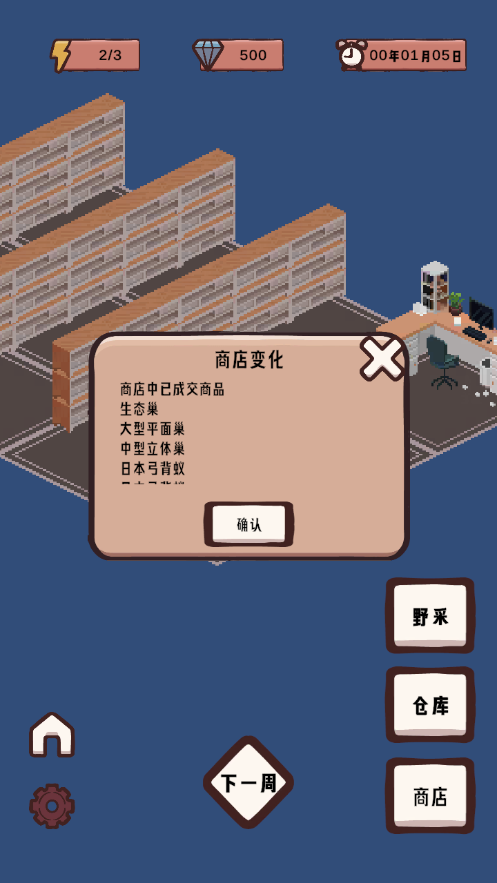 点击下一周后,柜子和商店会进行演算。柜子会计算蚂蚁的成长,商店则会按一定概率成交现有的订单,包括自己的和商店本身的。成交完毕后,商店会上架一些新的订单,目前是3窝蚂蚁和3个蚁巢。