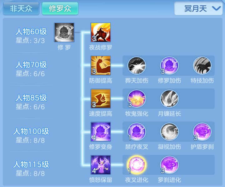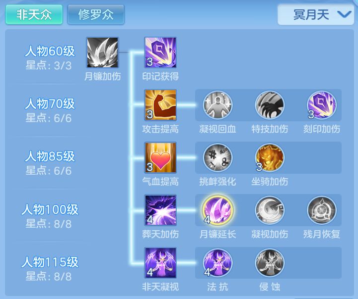 ① 日常玩家日常建议选星象一,入场就能有一个印记,爆发来得更早,常用技能修罗刻印、葬天伤害都有提升。月镰现在可以获得刻印之后蛮好用的,月镰延长到4回合,配合门派器灵,轻轻松松打满两次葬天。