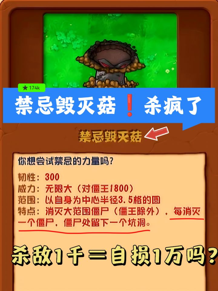 毁灭菇大家都知道吧?威力自不必多言了,但禁忌毁灭菇,直接是毁灭菇+坑洞的结合版,巨量伤害,除了僵王博士都是直接秒的,但每杀一个僵尸就要留一个坑,僵尸🧟♂️潮来袭的时候直接G了