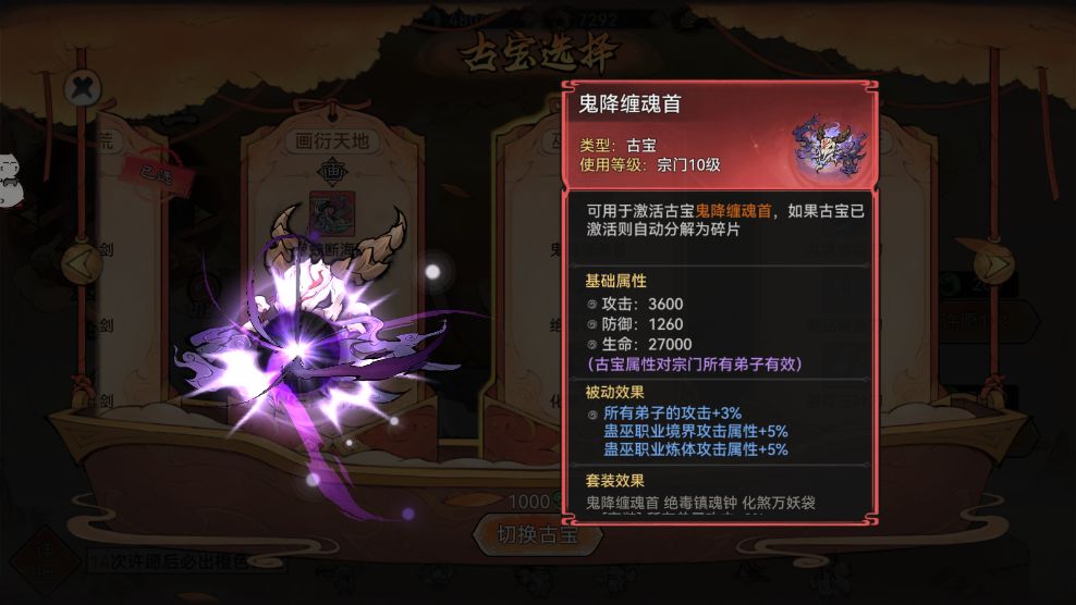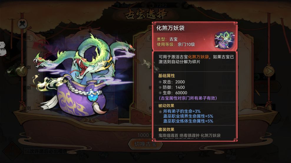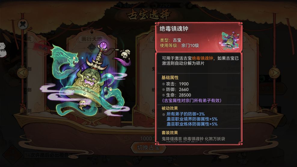 本次仙宝现世将带来与蛊巫相关的3个全新古宝,分别是鬼降缠魂首、绝毒镇魂钟、化煞万妖袋。