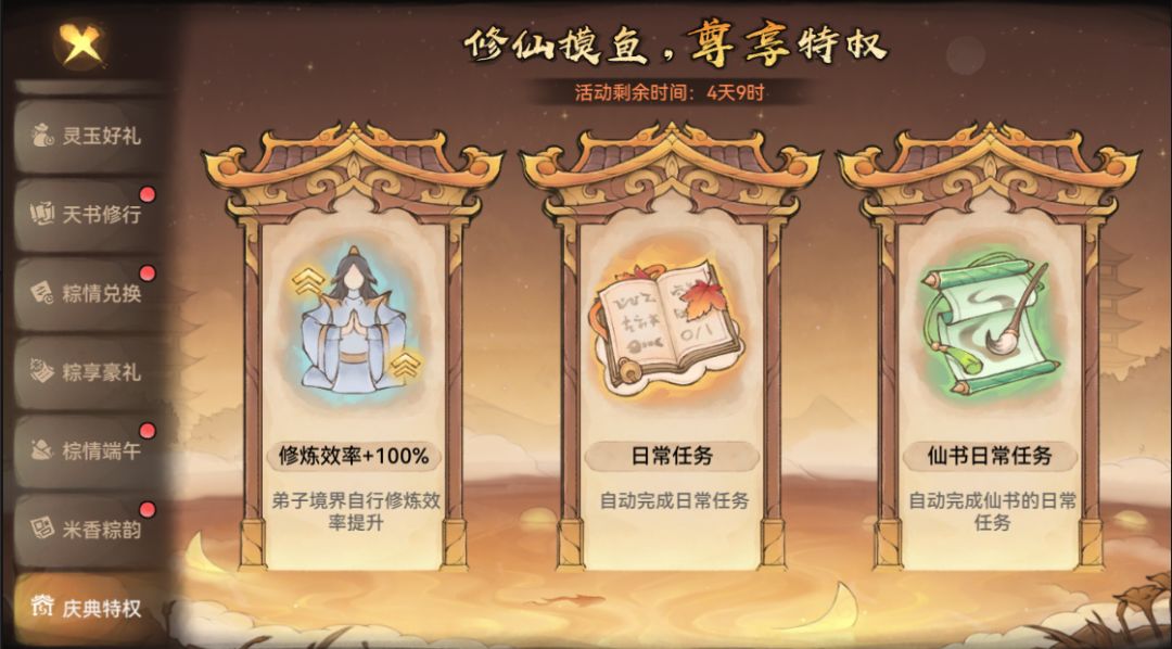 为了让各位祖师能在活动期间尽情享受主题活动的乐趣,猫子们届时会动用不知名力量来开启庆典特权,帮助祖师自动完成全部的日常以及仙书日常任务。
