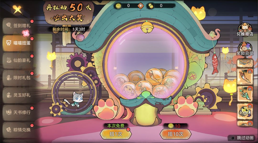 消耗【喵喵币】可以在喵喵扭蛋页面抽取全新道兵、功法、古宝等奖励。
