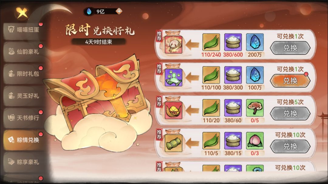 注:在6月6日~6月10日期间,通过完成灵草&灵木的生产,以及完成【天书修行】或者击败大世界/秘境中的怪物均可获取粽叶与灵米。