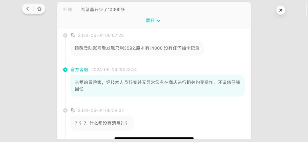 希望晶石莫名少了1w多,客服说我自己消费了叫我回忆, 多次声明我没有消费,并且我非常清楚的回忆了,我让客服提供我自己的账号消费说数据提供不了,涉及隐私,那你凭什么说我消费了? 我买啥了,强制克扣玩家晶石,客服回复永远一句话 仔细回忆, 你要我回忆什么, 回忆什么我从来没做的事情? 强迫我承认?? 吃相这么难看?