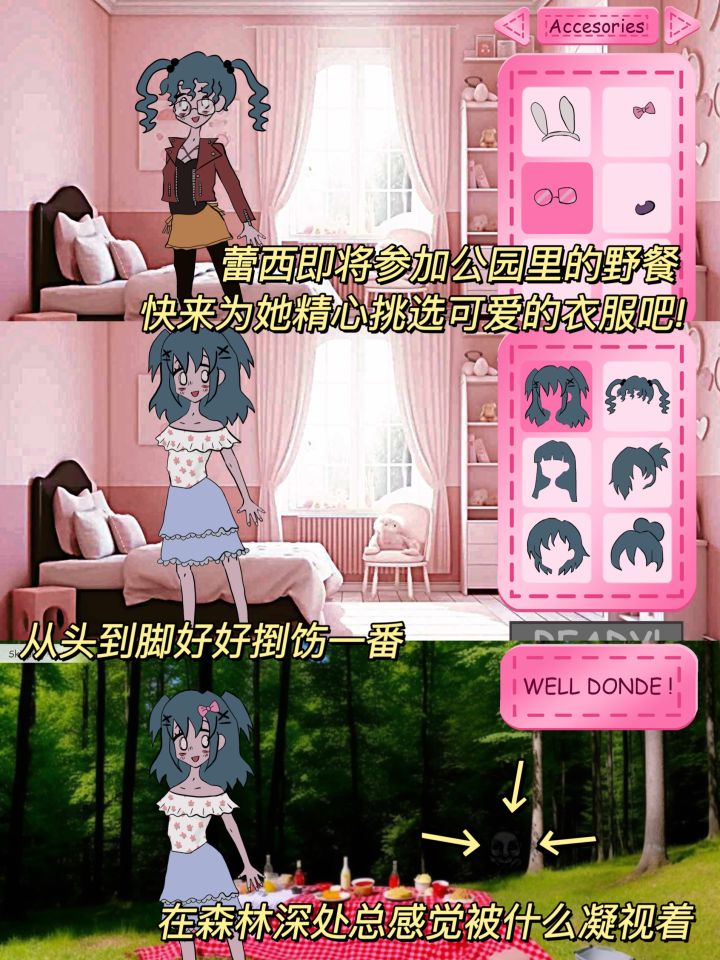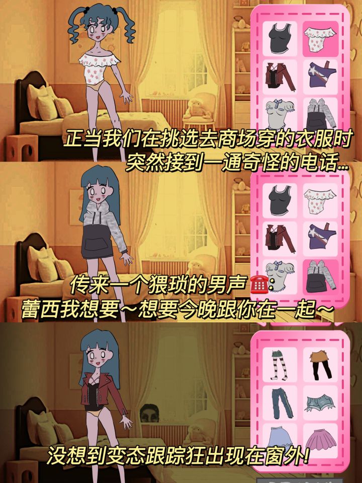 ✨在游戏中我们需要为蕾西挑选不同场景搭配的衣服,但一通突如其来的电话☎️打破了生活的平静!如果接下来再打扮美美的出门,可能会继续被跟踪狂尾随,甚至可能会发生意外……