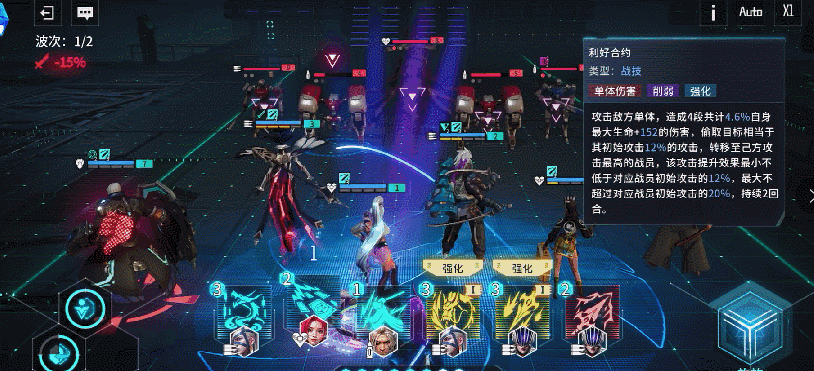 施放“利好合约”偷取目标攻击,转移至己方攻击最高的战员,看看我黑金商贩的厉害
